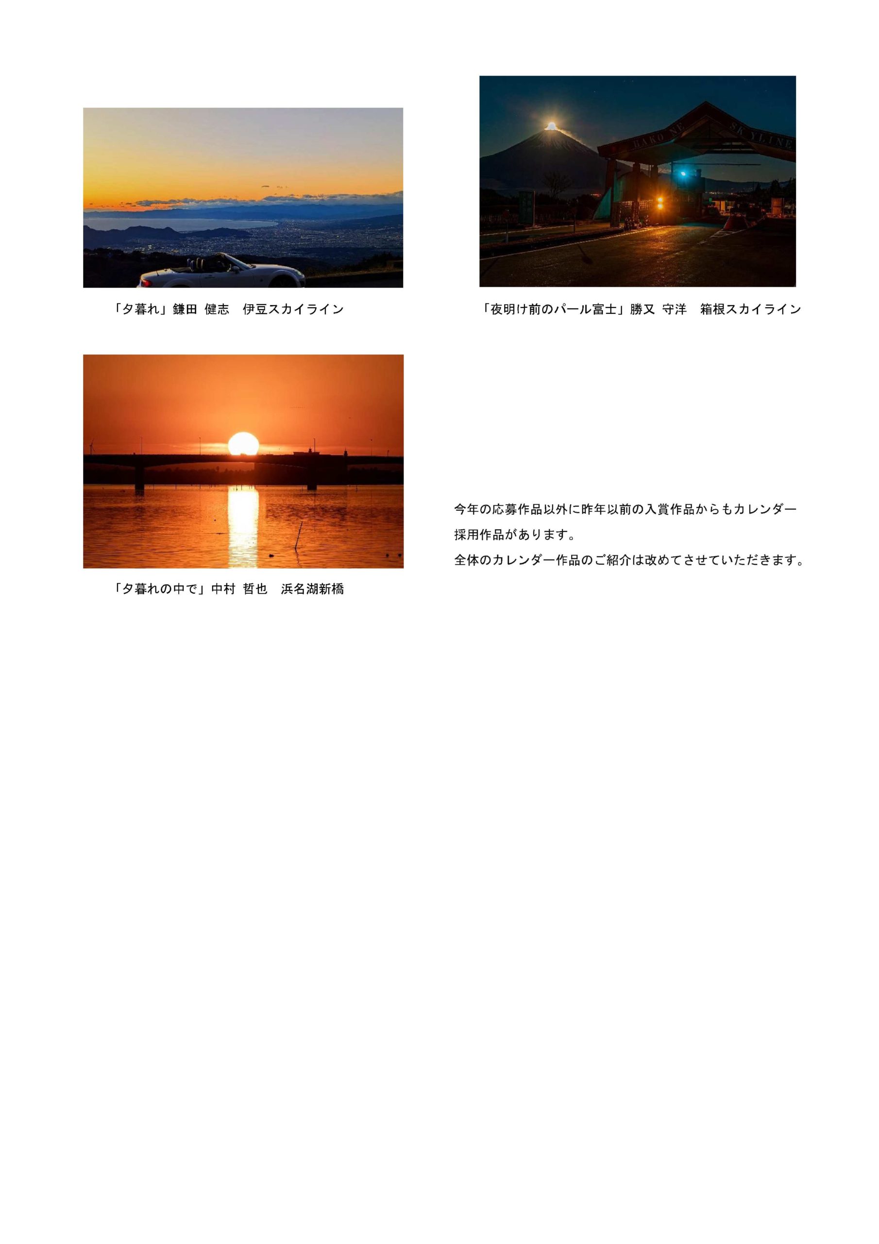主催者における審査の結果、「静岡県道路公社2026年版カレンダー」に掲載する写真として19点を選出させていただきましたので、お知らせします。