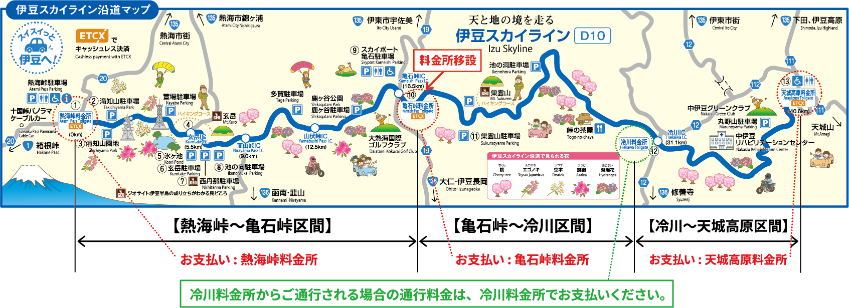 亀石峠は伊豆スカイラインの中間に位置しており、伊豆東海岸の伊東市宇佐美方面や伊豆中央部の伊豆の国市(大仁)方面へのアクセスが便利です。