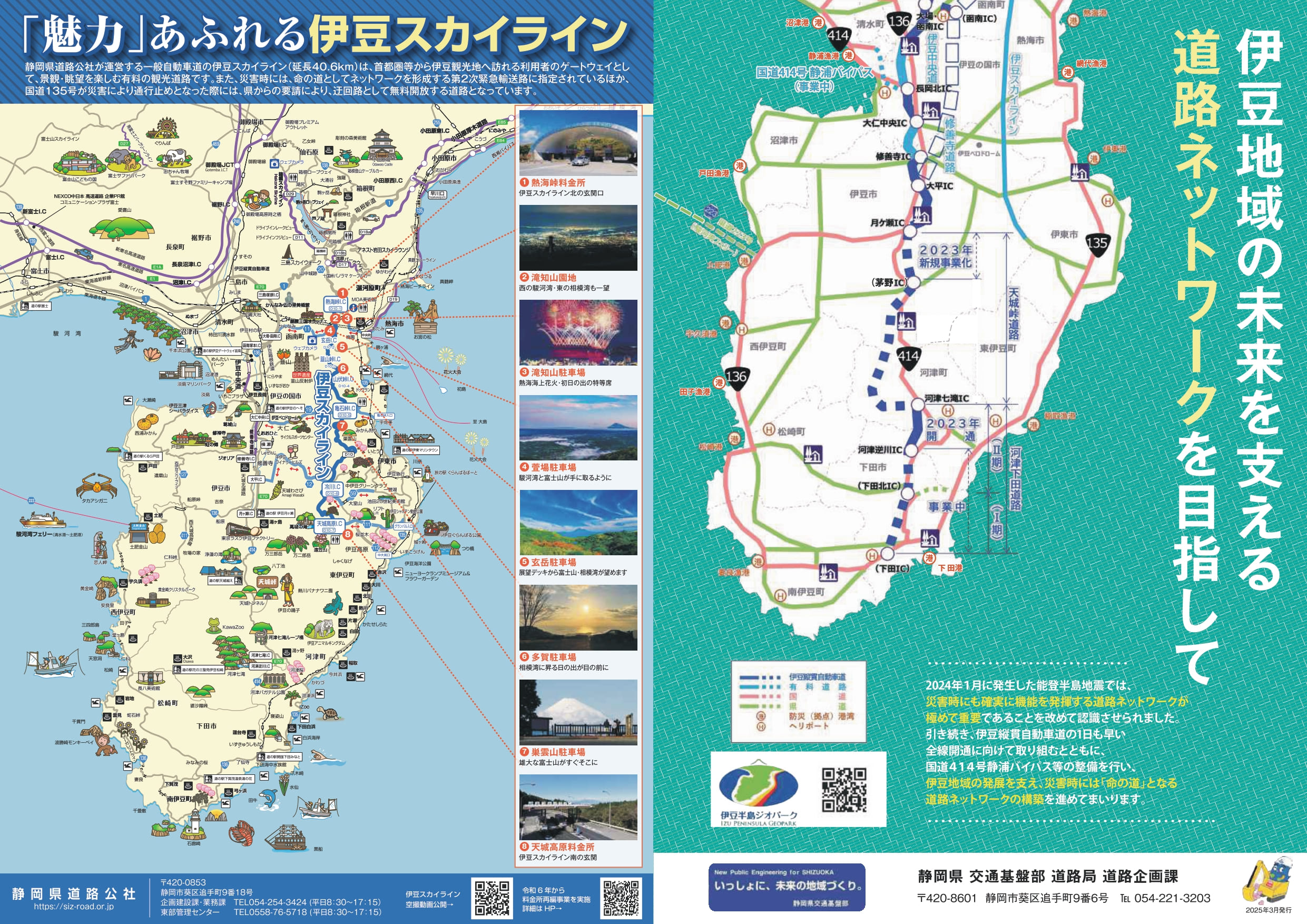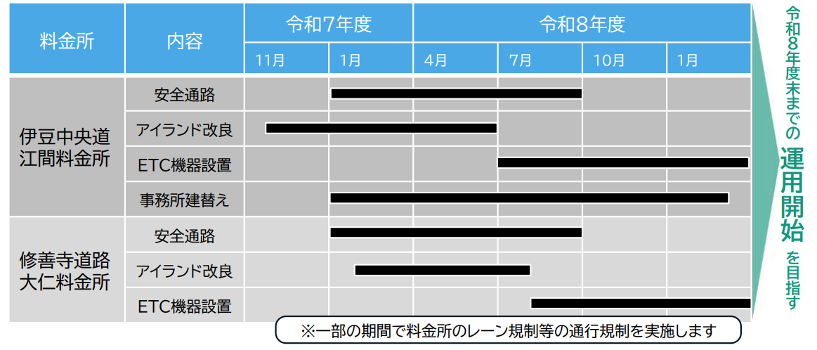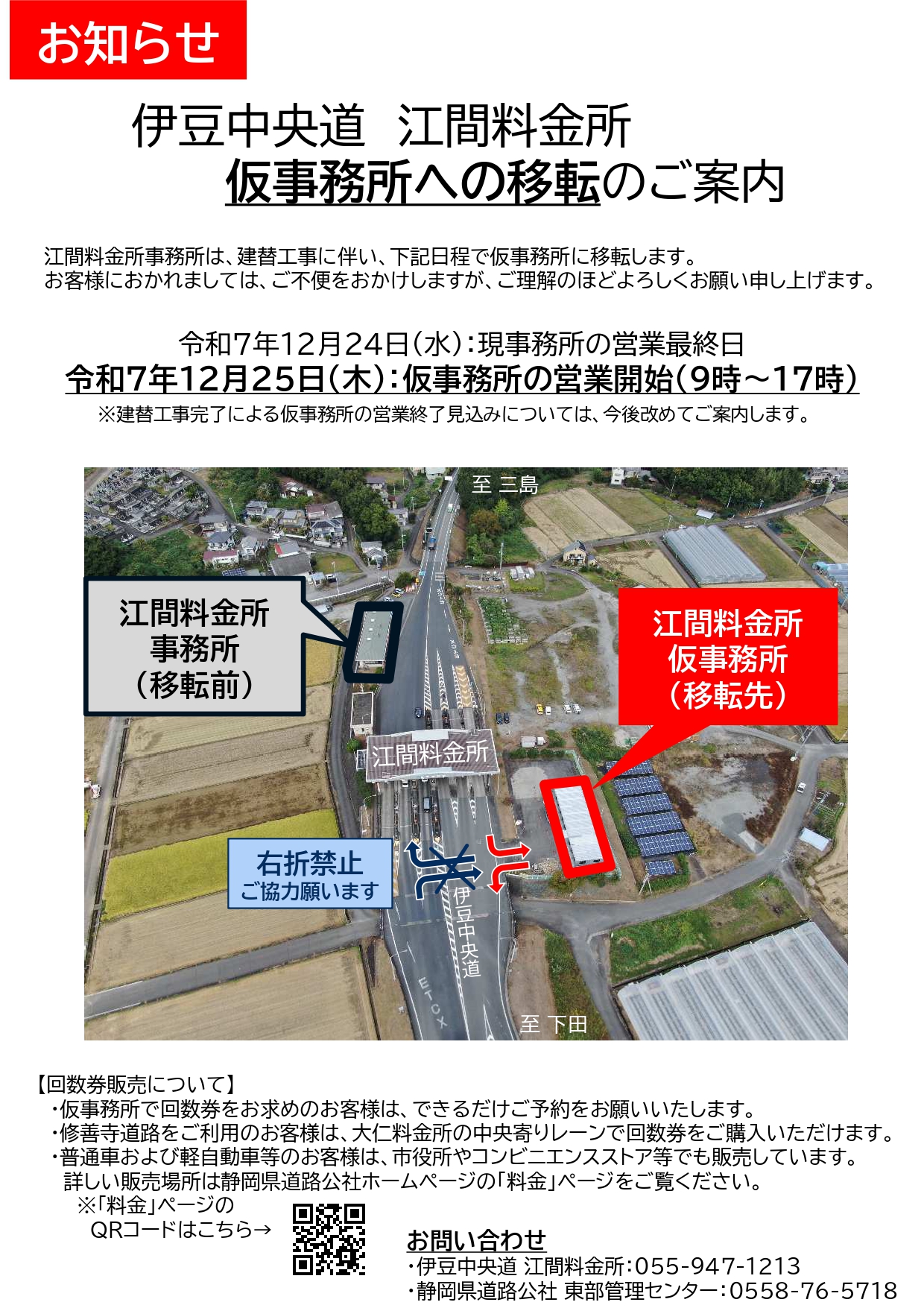 (1)伊豆中央道・江間料金所につきましては、料金所事務所建替えにより、令和7年12月25日から仮事務所での営業を開始します。位置が道路の反対側になりますので、案内をご覧いただき、出入りには十分ご注意ください。