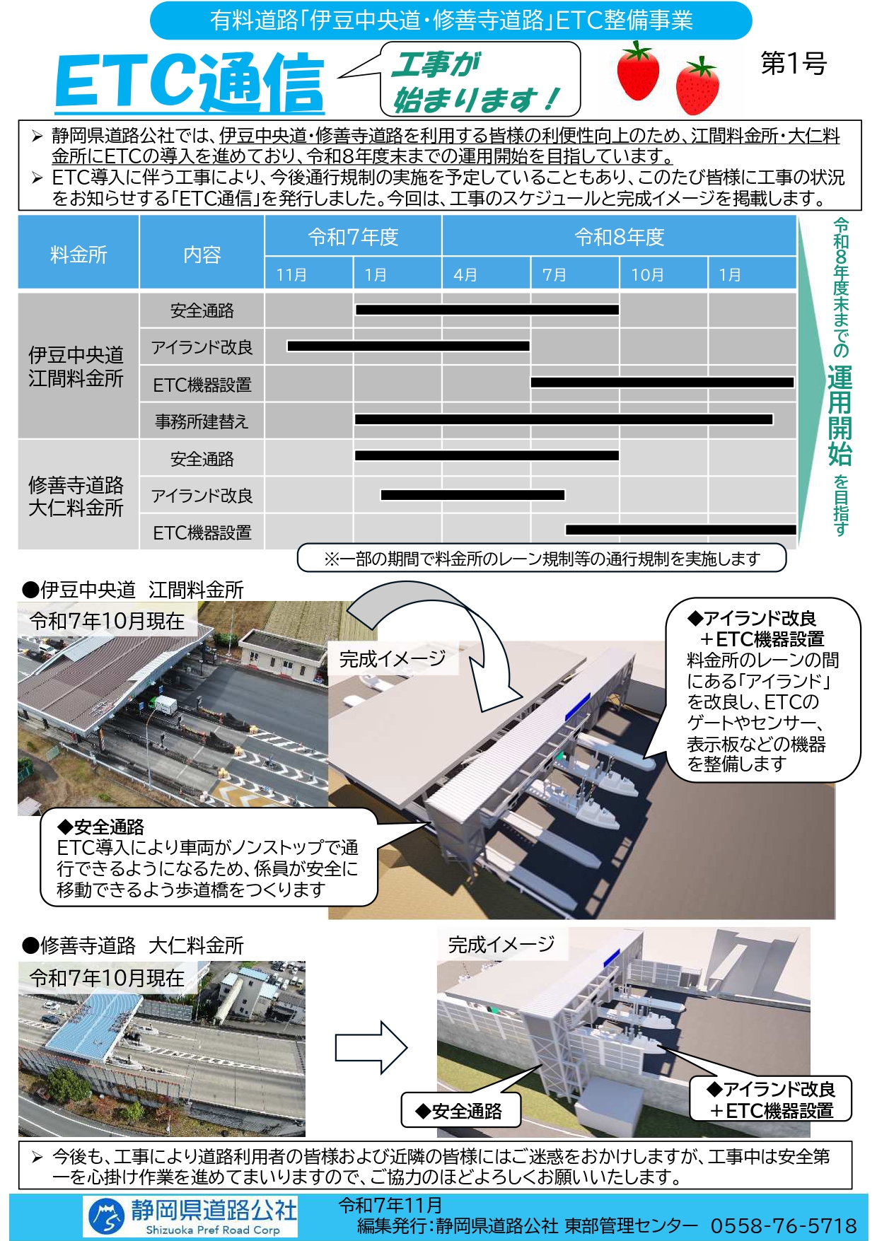 静岡県道路公社では現在、伊豆中央道・江間料金所、修善寺道路・大仁料金所にETCを導入する取り組み(ETC導入事業)を進めています。