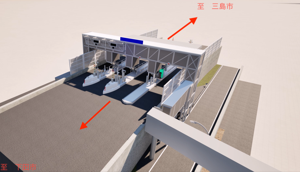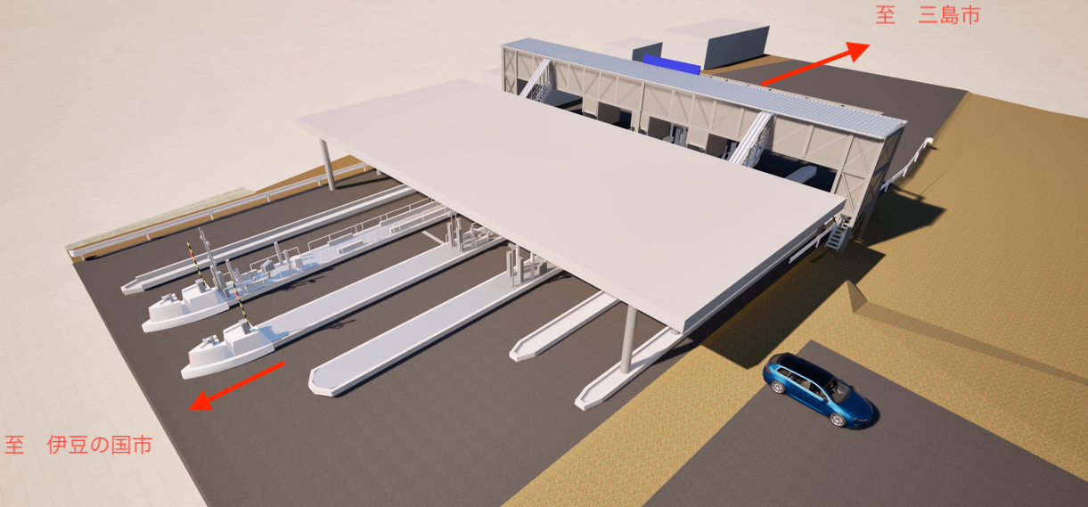 (2)修善寺道路大仁料金所 ・ETC機器設置 ETC専用レーンを上下線に1レーンずつ整備します。 ・アイランド改良 料金所のレーンの間にある「アイランド」(土台)をETC機器等設置のため改良します。 ・安全通路建築 ETC導入により車両がノンストップで通行するため、係員が安全に移動できるよう歩道橋を設置します。