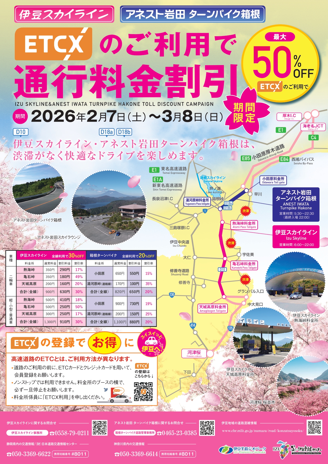 小田原から伊豆高原を結ぶ2つの自動車道「伊豆スカイライン」と「アネスト岩田ターンパイク箱根」では、いずれもETCXによるキャッシュレス決済が利用できます。今年はETCXをご利用いただくことで割引になるキャンペーンを実施します。今年最初の伊豆でのお花見は、ETCXを登録してスイスイっと、しかも割引でお得に旅行してみてはいかがでしょうか。
