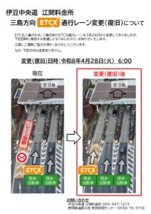 伊豆中央道(三島方向)では、ETC化工事に伴い、3月24日(火)からETCX利用可能レーンを変更しておりましたが、4月28日(火)の午前6時から従来のレーンに戻ります。